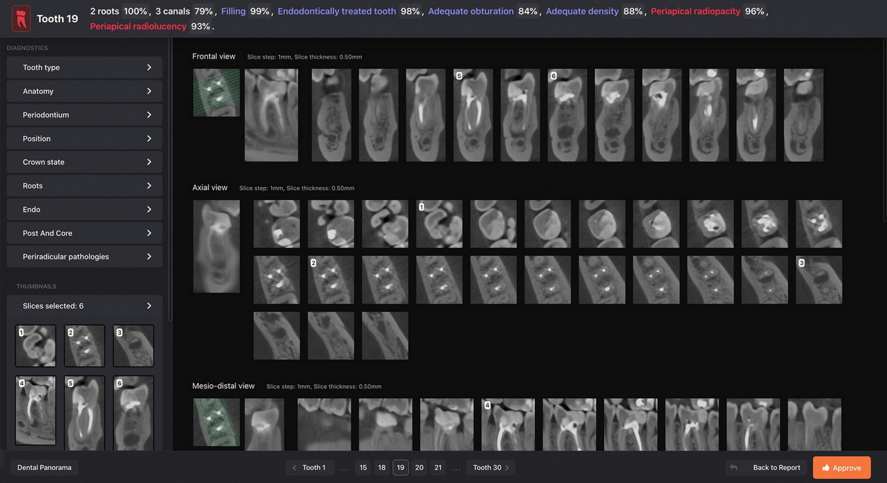 The intuitive interface assists the clinician in navigating through the entire scan, highlighting previously treated teeth and newly identified pathologies. The clinician can evaluate the images in two ways: